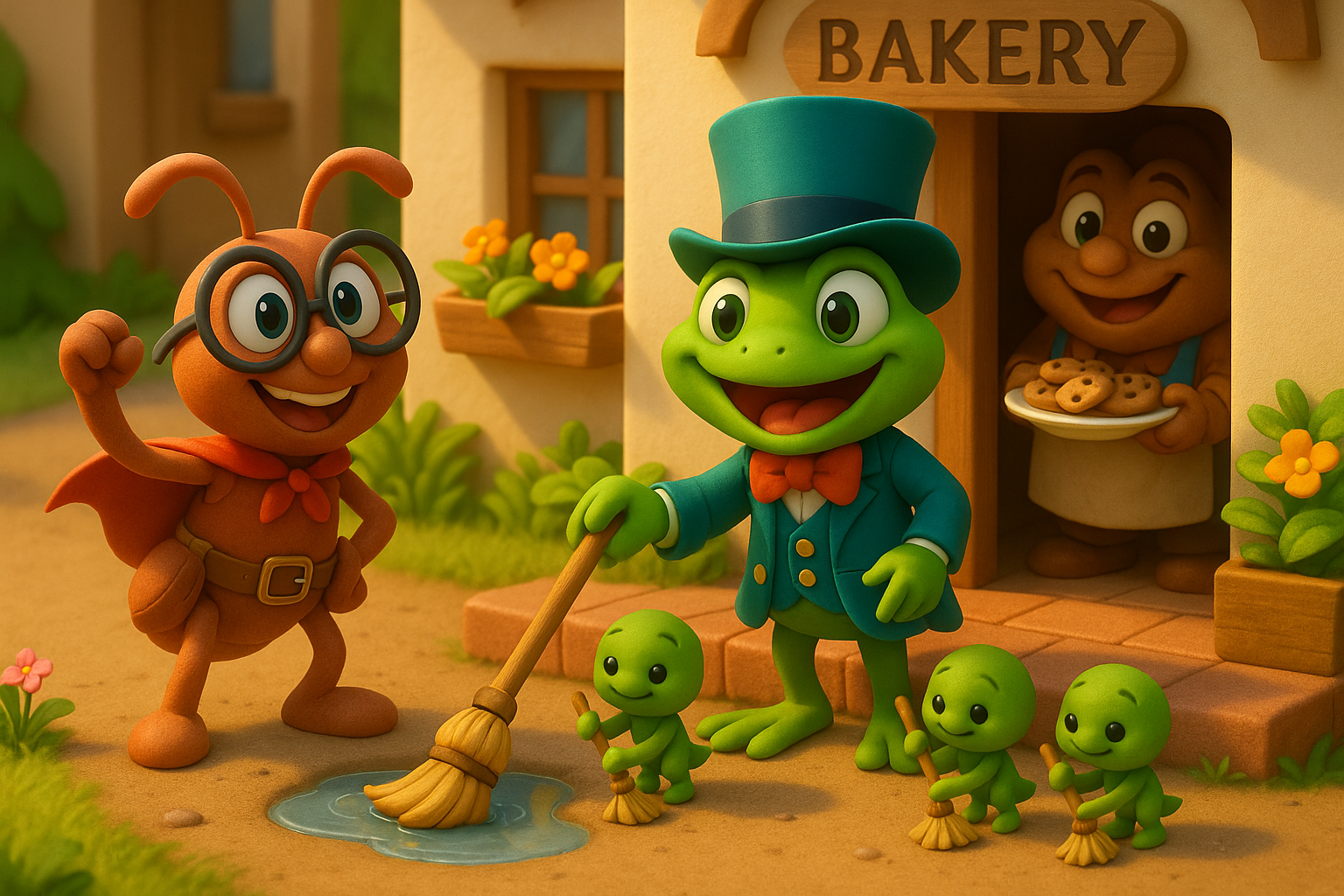 One afternoon, a bunch of young tadpoles splashed mud on the baker’s clean porch. Junior didn’t scold or stomp—he hopped right in and cleaned up, humming all the while. “Respect,” he said, “isn’t what you demand—it’s what you demonstrate.” He offered the broom first, like a handshake, and the giggles turned into effort.